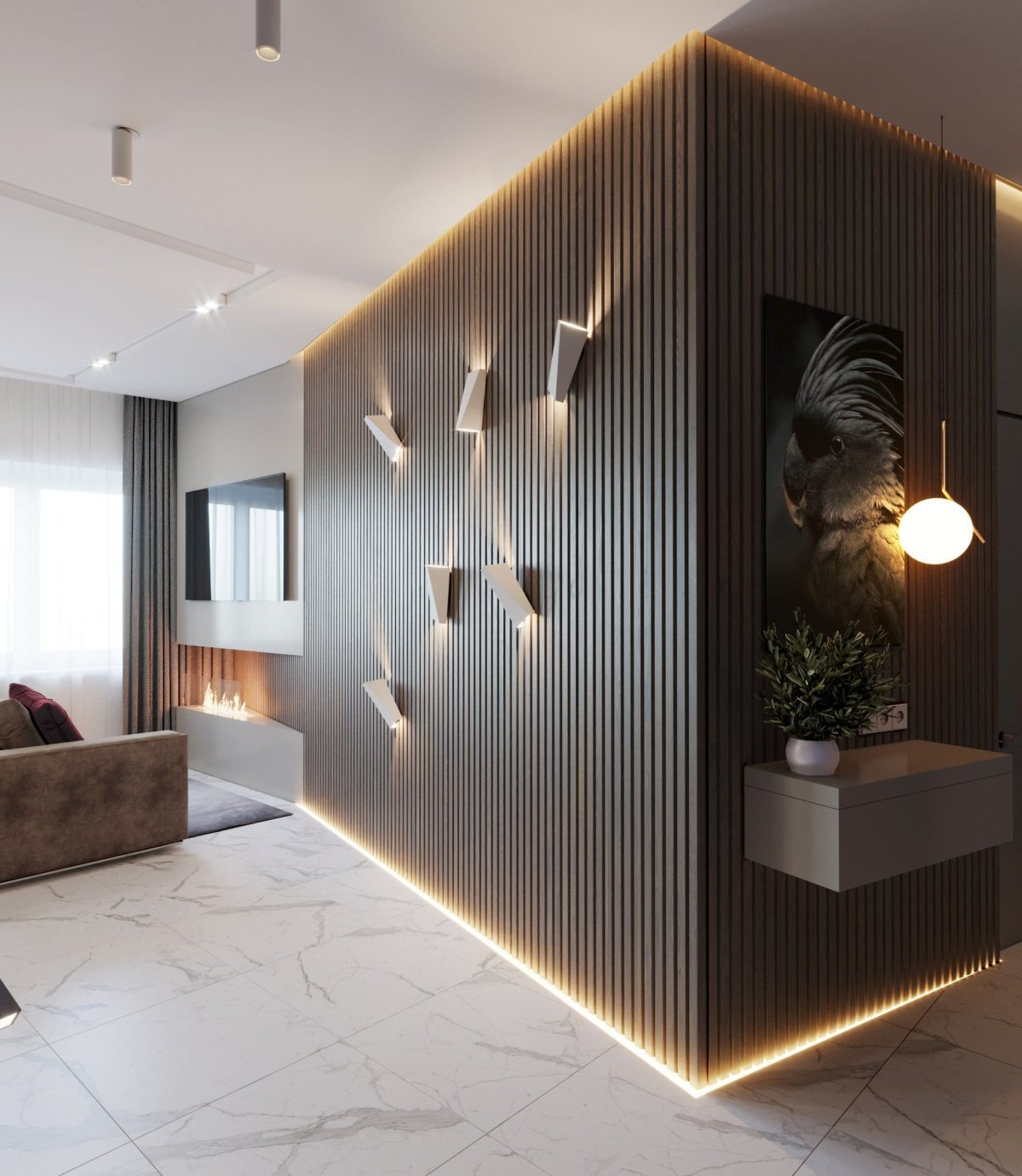 Декоративные элементы в интерьере. Если в дизайне много декоративных реек, баффелей или лепных деталей, их стоит согласовать с цветом плинтуса. Все элементы выделяются на фоне стен и потолка, придавая интерьеру графичность. Эту технику используют, когда нужно избавиться от эффекта пустых перегородок или упорядочить разные по размеру оконные и дверные проёмы.